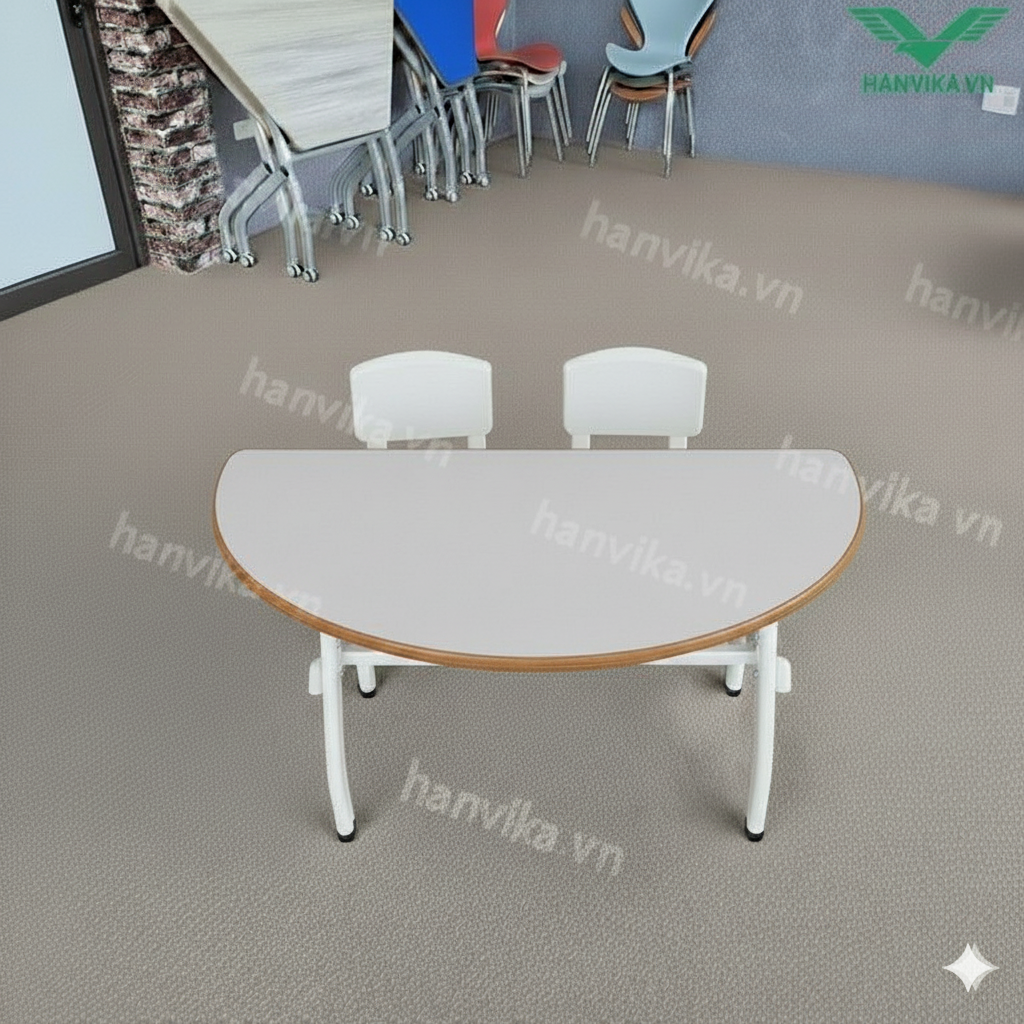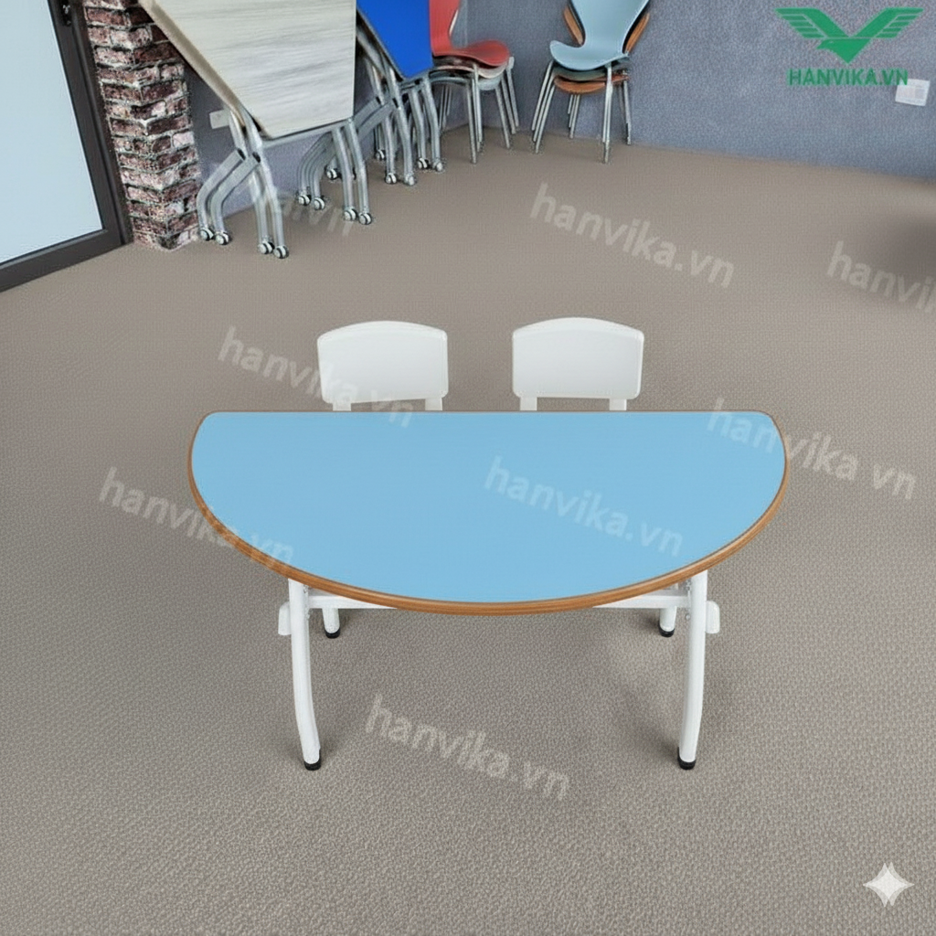 Bàn bán nguyệt đôi Hanvika – HVK-GD-B12 là lựa chọn lý tưởng cho môi trường học tập mầm non hiện đại, nơi cần sự an toàn, linh hoạt và tính thẩm mỹ cao.
