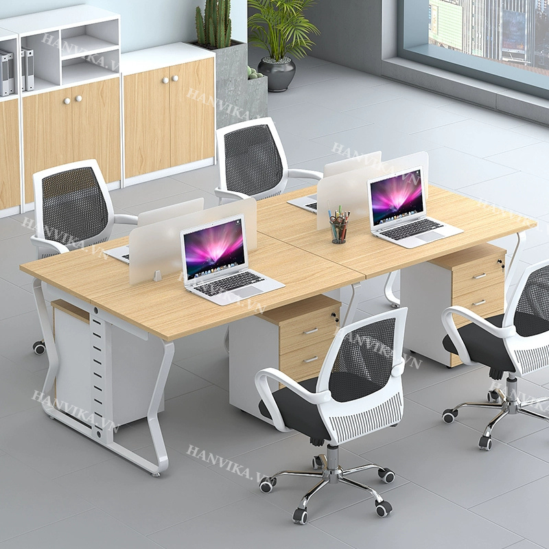Bàn làm việc được thiết kế dạng cụm 4 chỗ, chia thành 2 cụm đối diện nhau, mang đến giải pháp tối ưu diện tích cho mọi văn phòng. Kiểu dáng tối giản nhưng tinh tế, giúp không gian làm việc trở nên gọn gàng, khoa học.