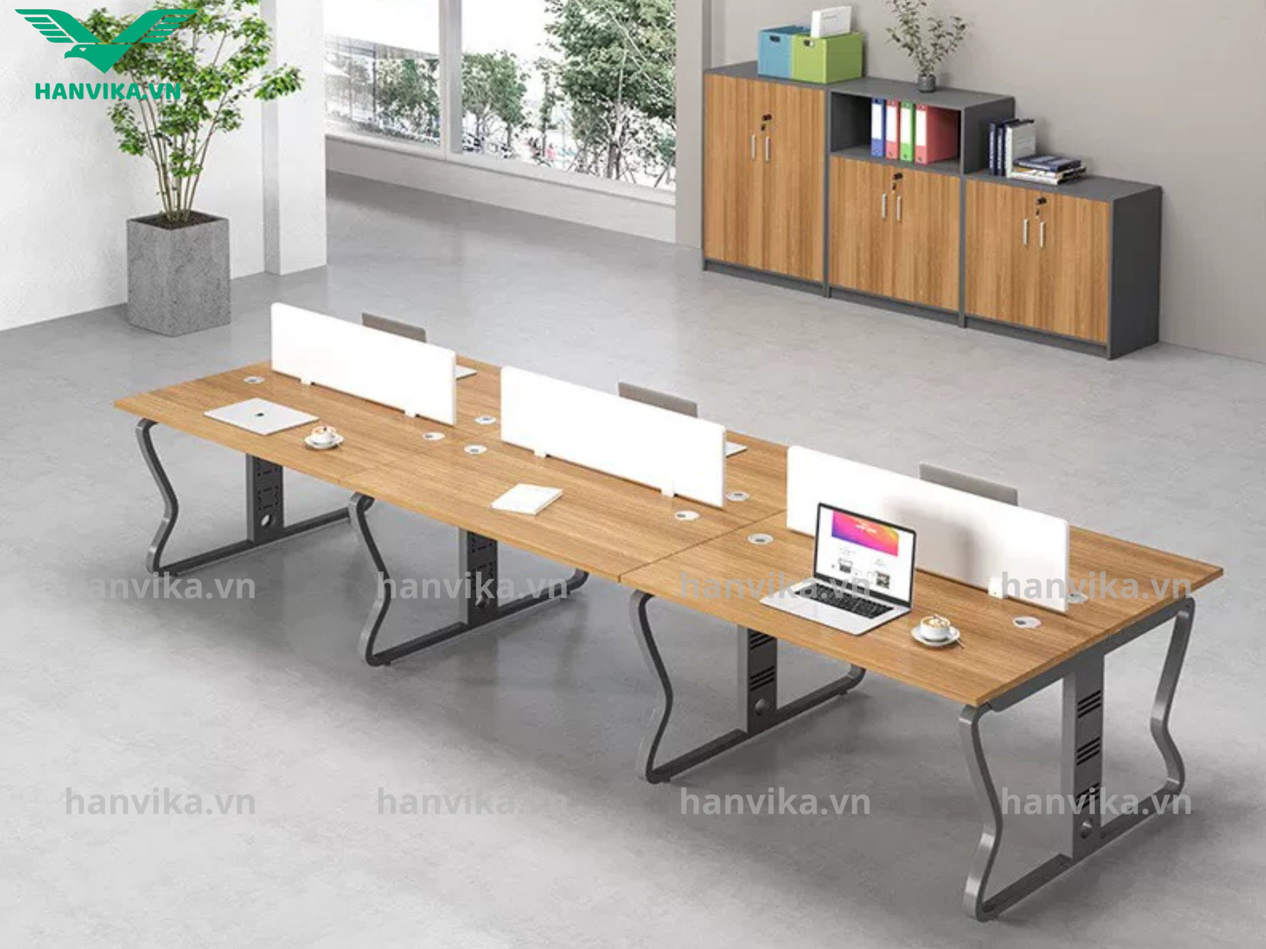 Cụm bàn 6 chỗ chân chữ Z hiện đại là lựa chọn hoàn hảo cho không gian văn phòng tối ưu diện tích và đề cao tính thẩm mỹ. Sản phẩm sử dụng khung chân chữ Z thép sơn tĩnh điện đen sang trọng, kết hợp mặt bàn gỗ công nghiệp MDF phủ Melamine dày 25mm chống trầy xước, chống ẩm, dễ vệ sinh. Thiết kế cụm đối xứng 2 – 2 với vách ngăn trung tâm giúp vừa đảm bảo sự riêng tư, vừa khuyến khích tương tác nhóm. Kích thước tiêu chuẩn phù hợp nhiều loại văn phòng, dễ dàng tùy chỉnh theo nhu cầu và bố trí không gian.