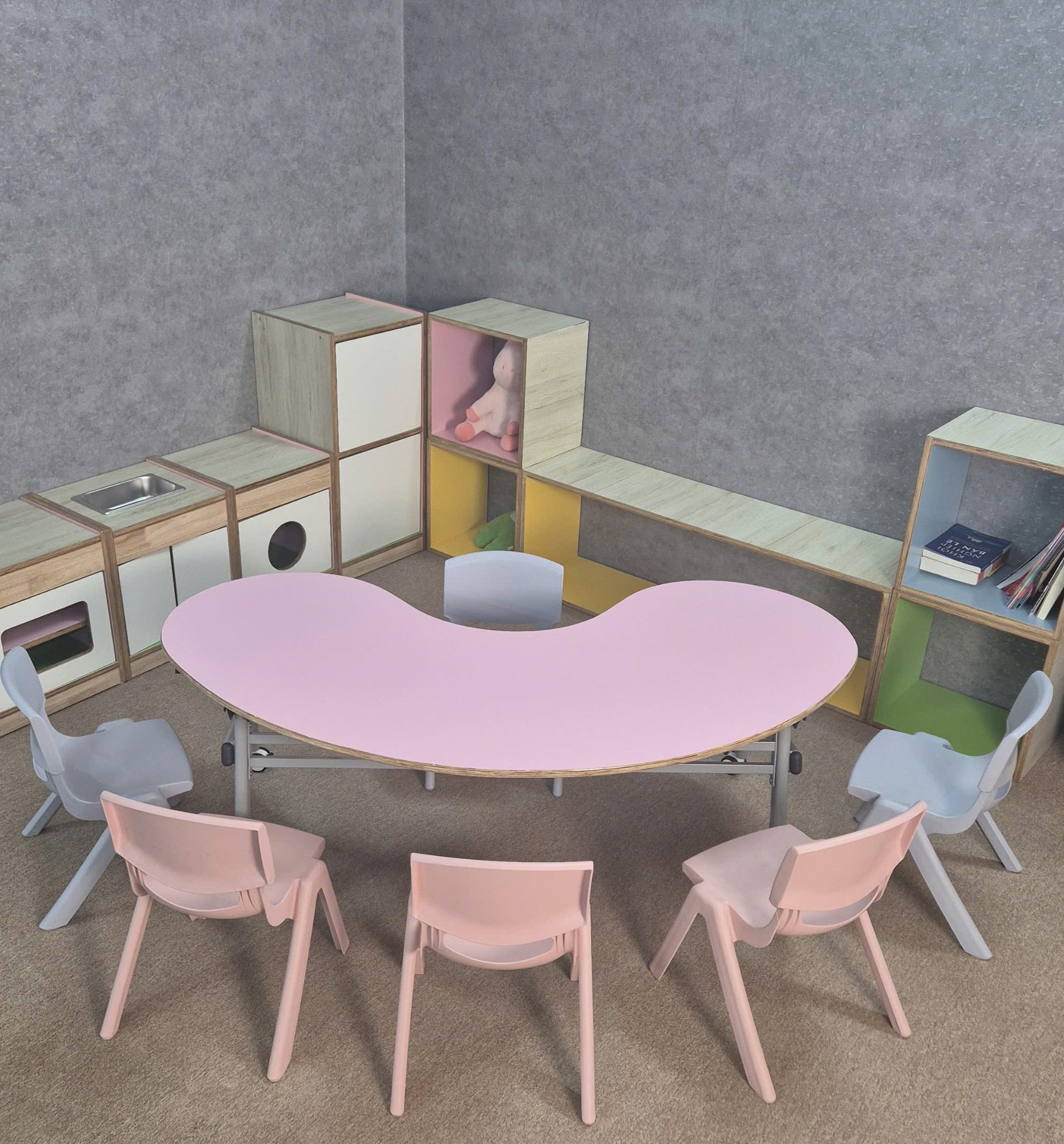 Kiểu dáng bo cong hình hạt điều tạo nên đường nét mềm mại, thân thiện, giúp bé ngồi học theo nhóm dễ dàng trao đổi và hợp tác.