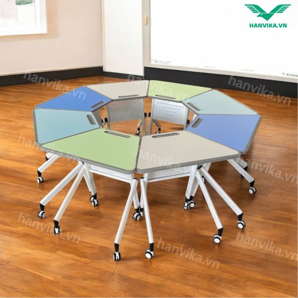 Bàn thang bát giác viền nhựa đơn Hanvika – Bàn học sáng tạo, thiết kế hiện đại cho trung tâm đào tạo, lớp học – HVK-GD-B09
