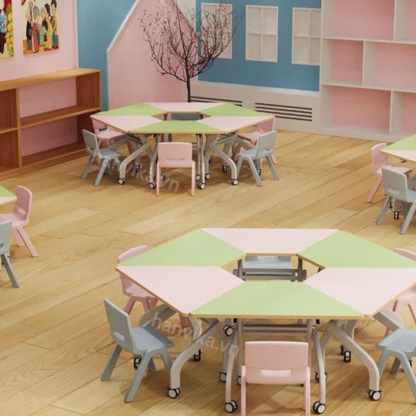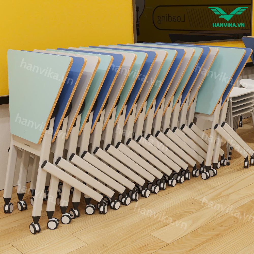 Đặc biệt, chân bàn có thể lồng vào nhau, giúp tiết kiệm tối đa không gian lưu trữ – một giải pháp lý tưởng cho các phòng học có diện tích nhỏ hoặc thường xuyên cần linh hoạt bố trí.
