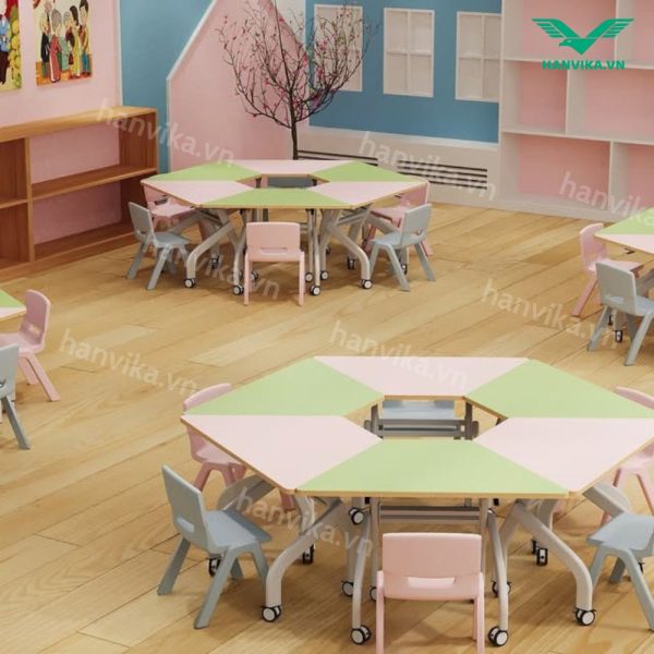 Bàn thang lục giác đơn trung tâm Hanvika HVK-GD-B08 là dòng bàn học nhóm cao cấp được thiết kế đặc biệt dành cho không gian lớp học sáng tạo, trung tâm đào tạo và trường học hiện đại. Với kiểu dáng thang lục giác độc đáo, bàn mang đến sự linh hoạt trong cách bố trí, giúp học sinh dễ dàng tương tác và học tập theo nhóm hiệu quả.